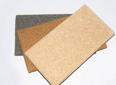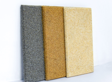 微粒材料是一種新型綠色裝飾材料,具備優(yōu)異的聲學性和物理性能。該材料是以天然砂粒或經環(huán)保處理的固廢顆粒為骨料,以環(huán)保膠凝劑,通過壓振工藝,生產的具有大量相互連通的微小空隙的多孔材料。